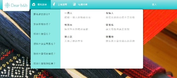 Dear b&b "尋找旅宿" 的選單中,可以選擇分類方式: